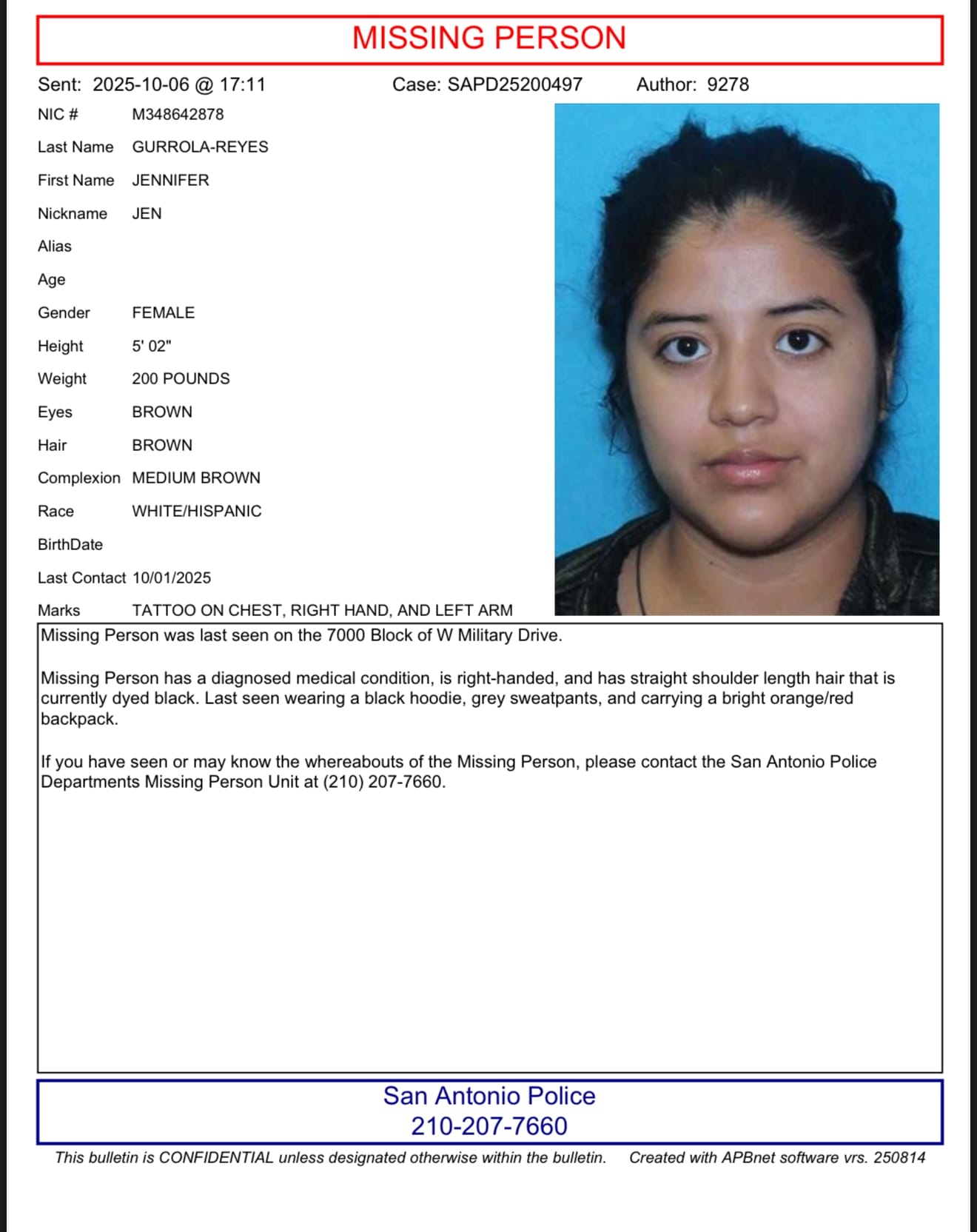 The Texas Center for the Missing is urgently sharing the disappearance of Jennifer Gurrola-Reyes, who has been reported missing from San Antonio, Texas. Her family is devastated and desperate for answers — and they are asking for your help.